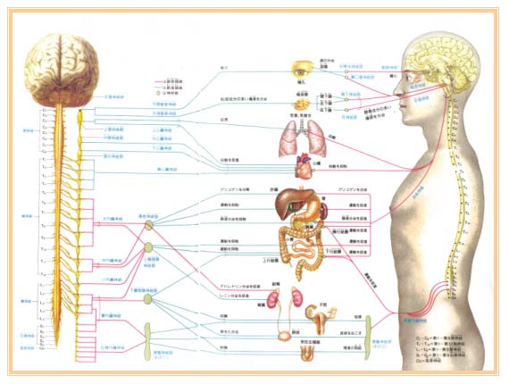 私達の身体は、脳と神経系を通して全身の調和を保っています。循環器系、呼吸器系、消化器系、内分泌系、筋骨格系等の全てを統括し、調和を保っているのは、神経系の働きです。神経系の中でも特に中枢神経と呼ばれ、重要な部分に脳と脊髄があります。頭蓋骨に護られた部分が脳、背骨に護られている部分が脊髄と呼ばれています。脊髄から枝分かれした神経は、顔の表情、手足の動きなどを可能にして、私たちの命を表現する運動神経や、痛みなどの感覚を司る知覚神経が含まれています。また、自律神経と呼ばれる神経は内臓器官の働きや循環、呼吸などの機能を司ります。